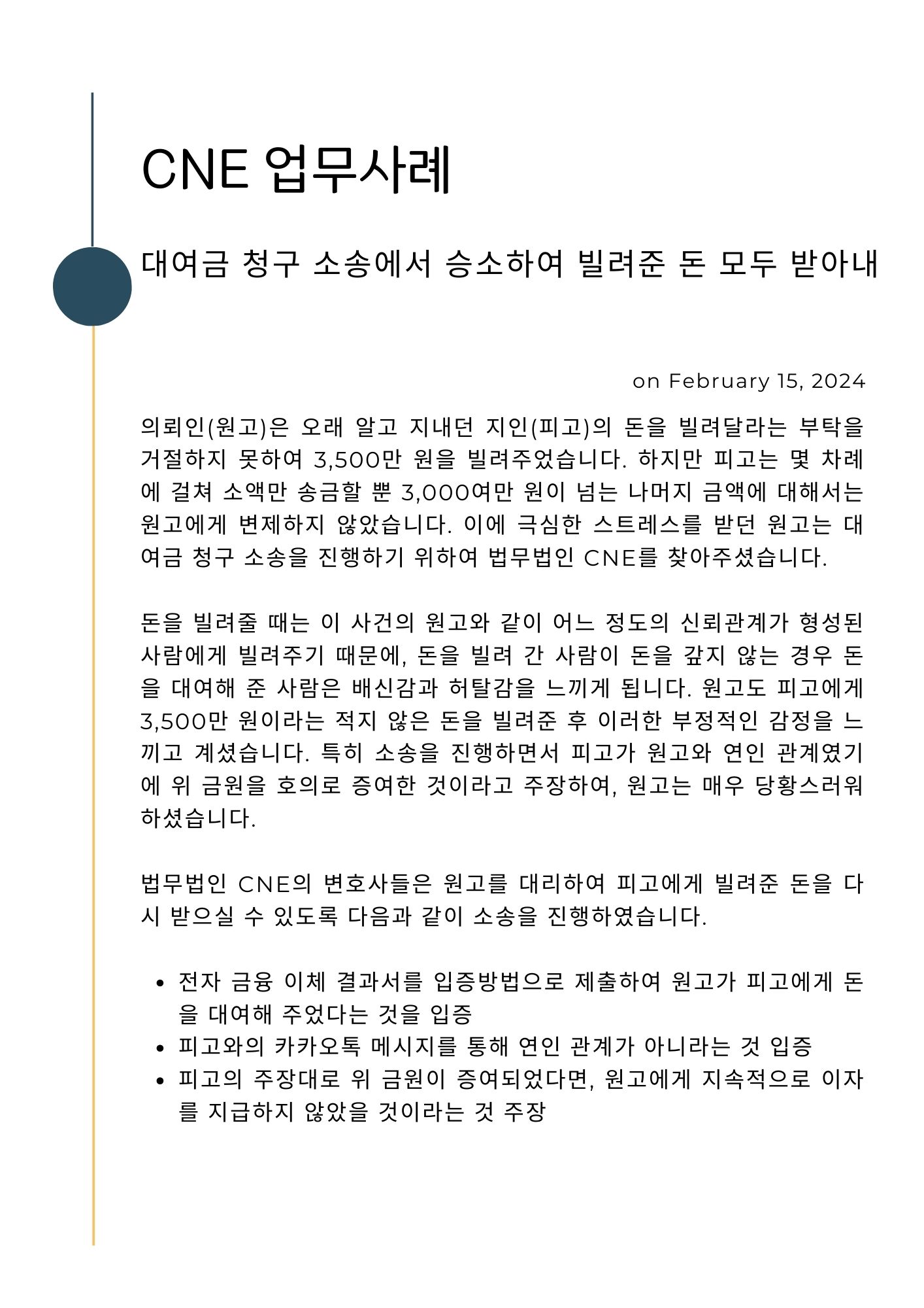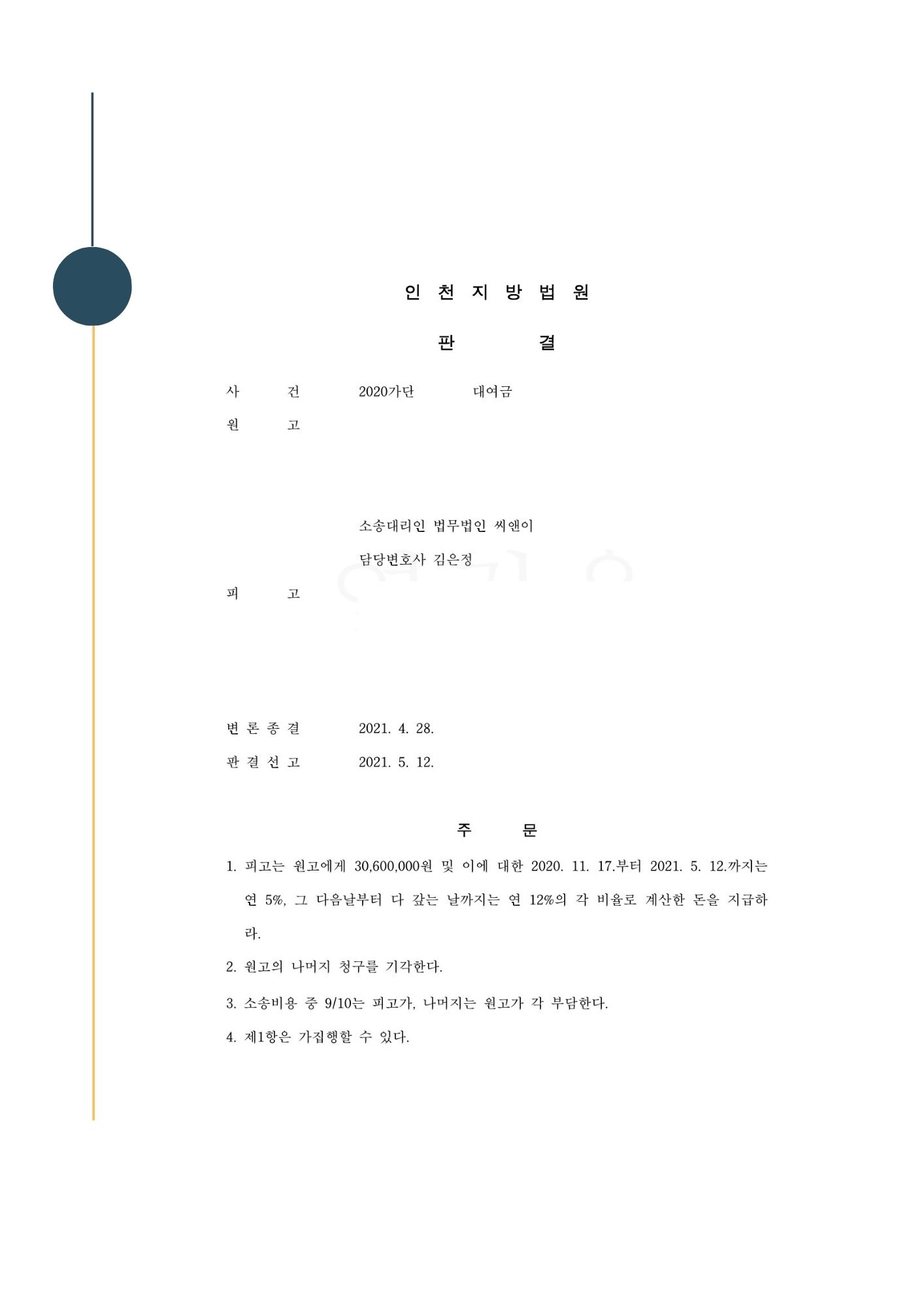 [업무사례] 대여금 청구 소송에서 승소하여 빌려준 돈 모두 받아내